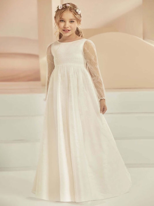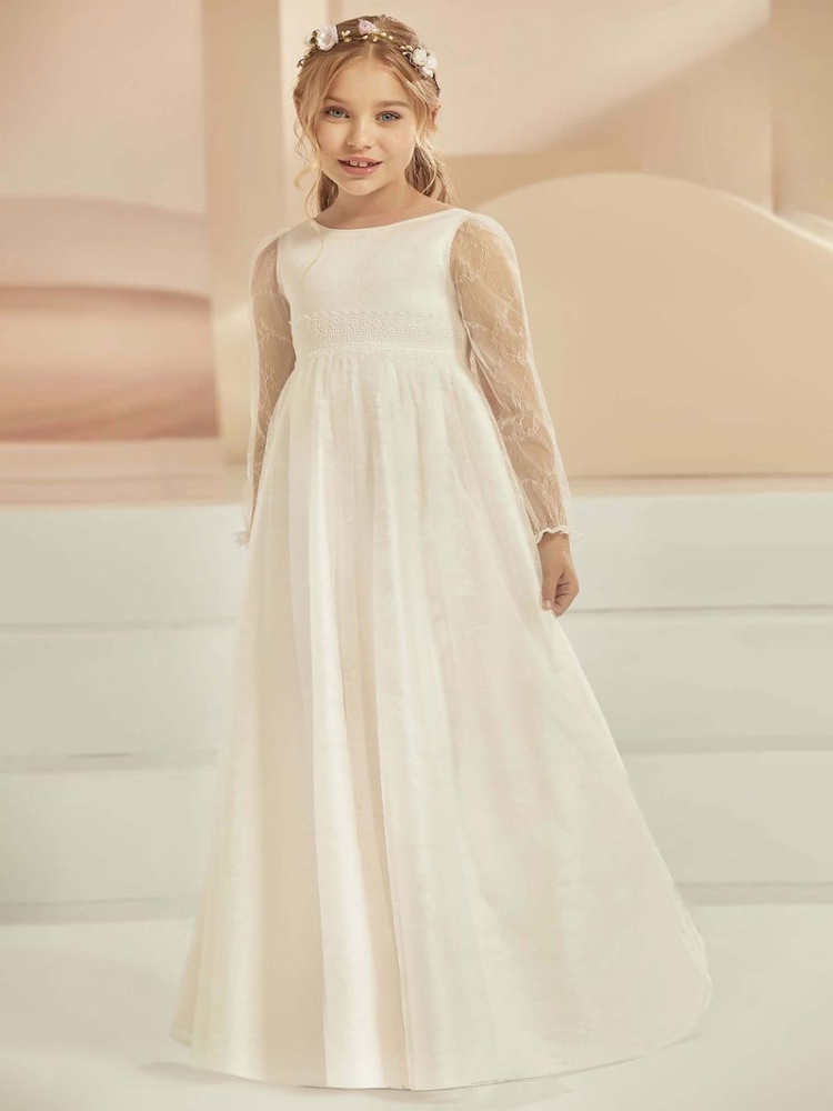 Dies ist ein schönes Kommunionskleid aus Spitze mit schönen Details. Das Kleid hat einen runden Ausschnitt und durchsichtige Ärmel.