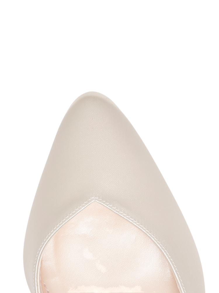 Eve verbindet eine elegante Silhouette mit einem Absatz, der sich wirklich tragen lässt. Gefertigt aus glänzendem Satin in Elfenbein und mit silberfarbener Einfassung, wirkt dieses Modell modern und klassisch zugleich. Die mandelförmige Spitze und der herzförmige Ausschnitt strecken den Fuß optisch, der geschlossene Fersenbereich mit geschwungenem Riemchendetail unterstreicht die feminine Linie. Das Fesselriemchen hält zuverlässig, der Blockabsatz sorgt für Standfestigkeit.